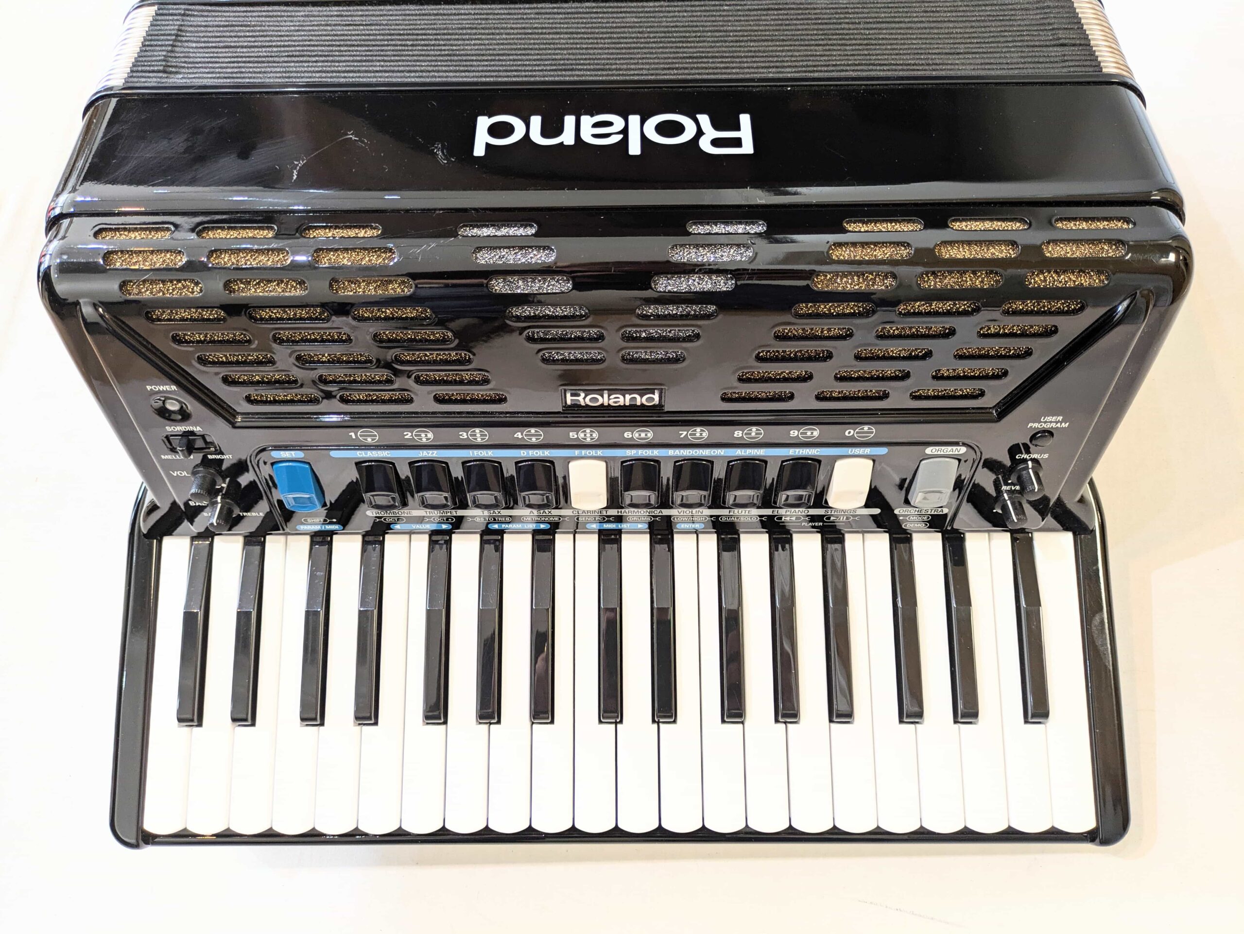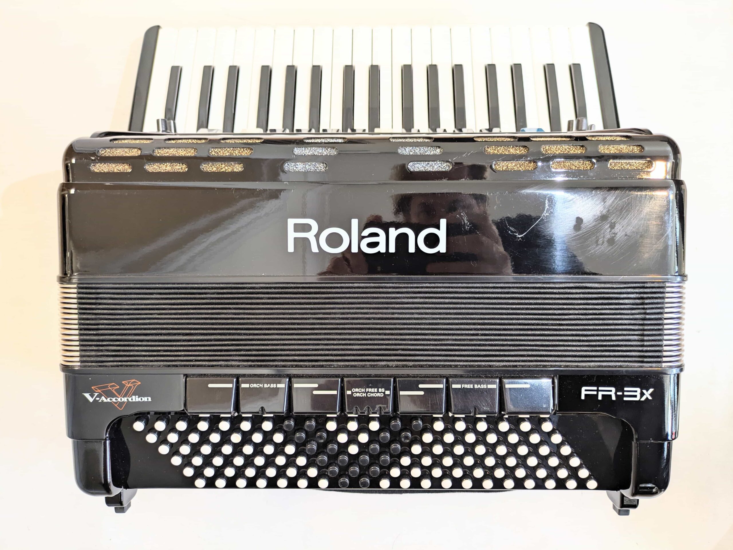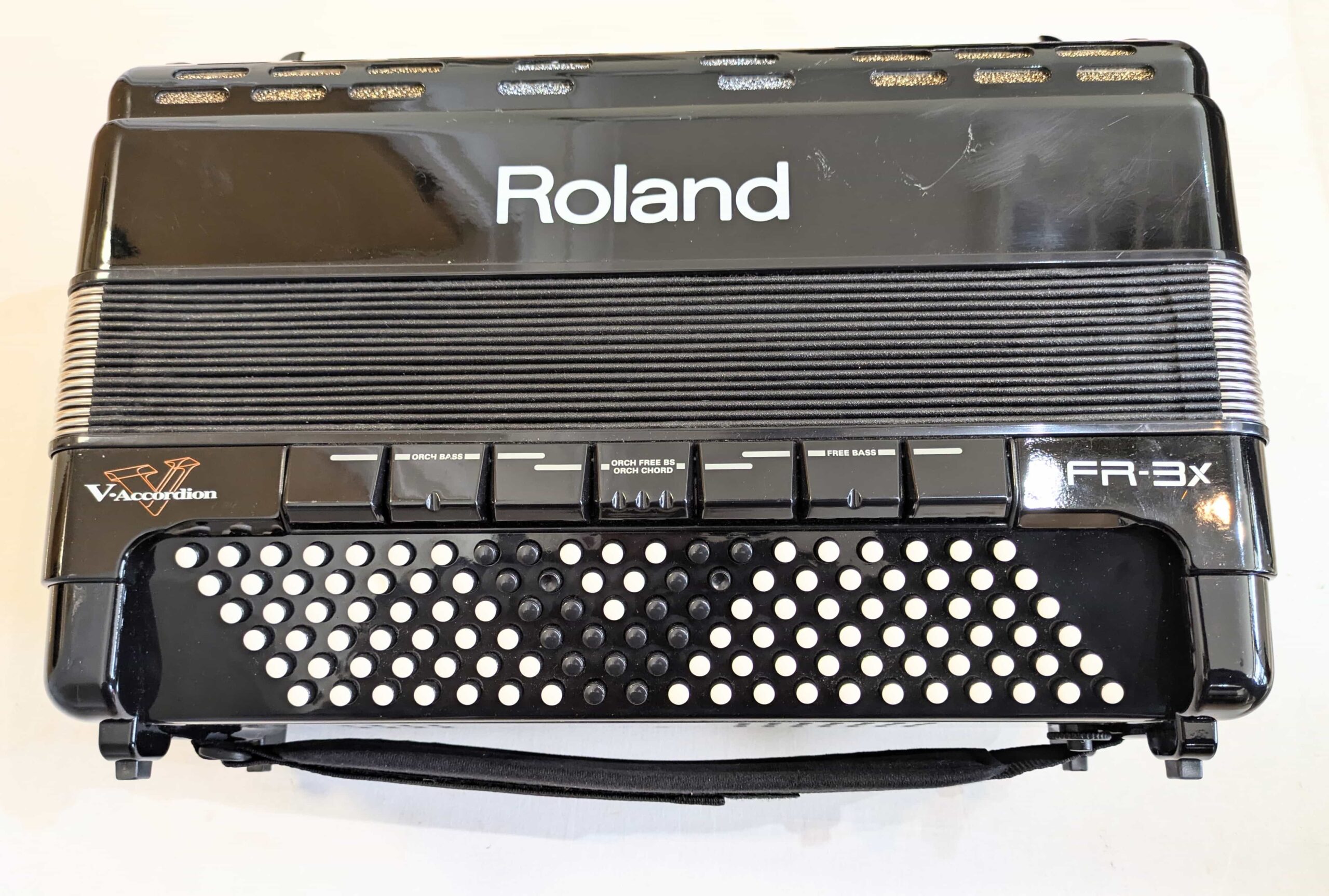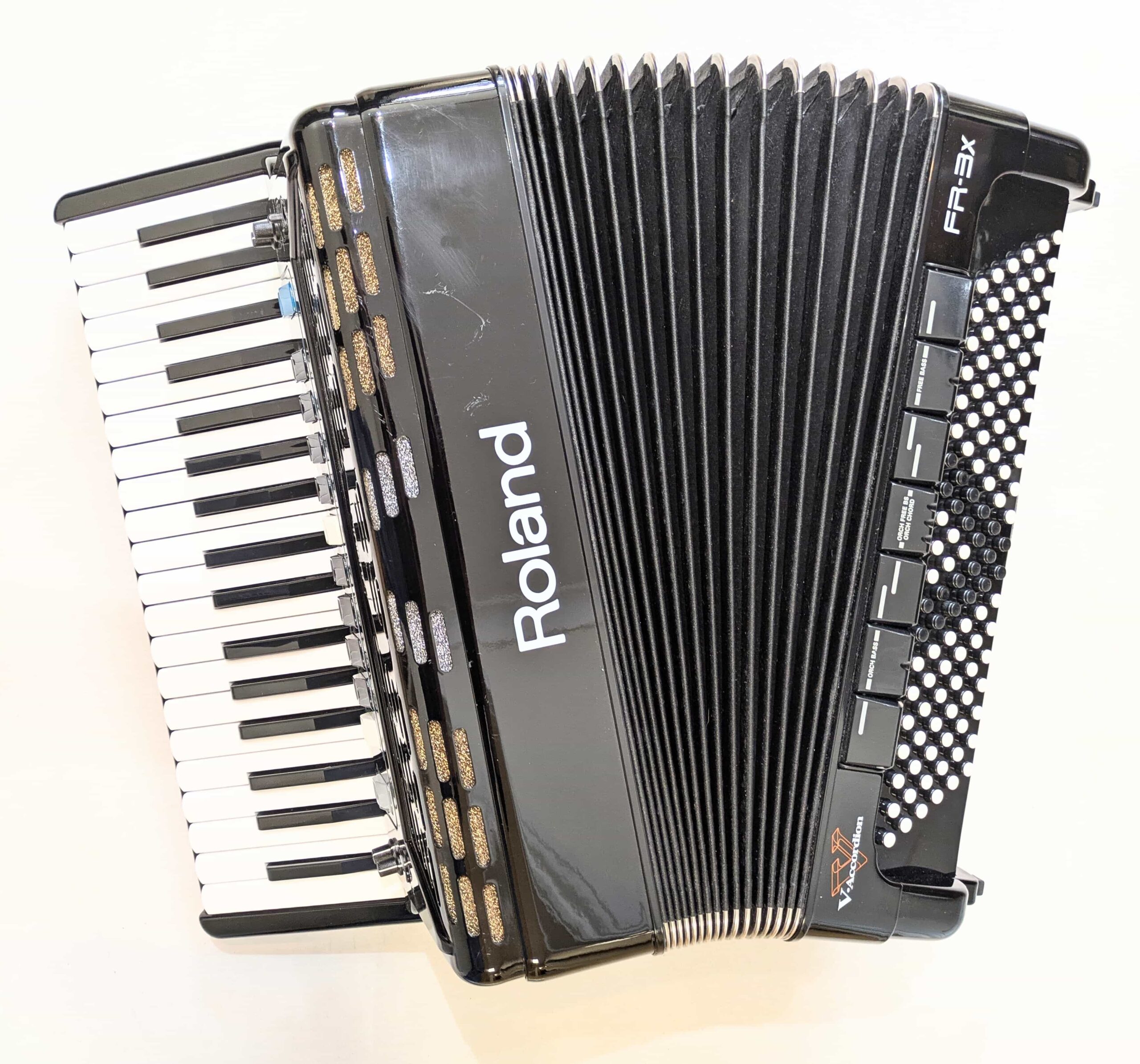 A preowned Roland FR-3X 120 bass accordion. The Roland FR-3X 120 Bass Compact V-Accordion is the perfect combination of the familiar sounds of a traditional acoustic accordion, with all features and advantages of a modern digital instrument. Thanks to the new bellow pressure sensing system on the revised model, the FR-3X now offers faster response, higher sensitivity and precision, plus better detection of the opening and closing of the bellows. This instrument also features a USB port, which enables many additional features including allowing the user to customise the many accordion, orchestral and organ sounds, as well as saving data and MP3 playback. This lightweight and portable accordion features 37 keys and 120 bass, and is ideal for all players from students to professional stage performers. This extremely versatile digital accordion is ideal for all styles of music, and boasts a multitude of voices, including accordion, orchestral, organ and percussion tones. Featuring 120 bass with a 37 key setup, this Roland FR-3X 120 Bass Accordion is ideal for anybody looking for an accordion with the full bass range, but without the weight and size of a full size 41 key model. This particular pre-owned example is finished in an attractive high gloss black casework, which does have a few minor age related marks and scratches, hence the low price.